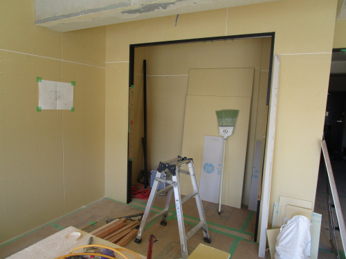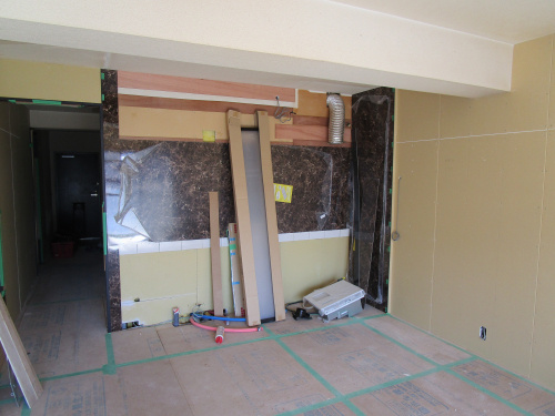 <改装中>キッチンパネル設置 システムキッチンはライトな木目調 付くのが待ち遠しいです!
