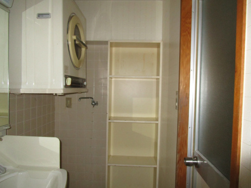 <改装前>洗面所とお風呂もスペースを広げ、長年使われた電気式乾燥機は最新型のガス衣類乾燥機に変更します!
